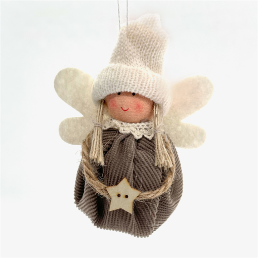 Ängel gjord av trä med tygkläder i brunt. Broderier vid halsen, yllemössa och en stjärna i handen.