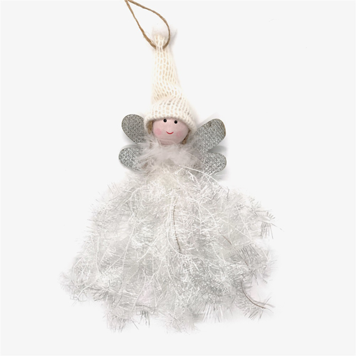 Två söta änglabarn i trä med pälsaktig, vit klänning och vingar av filttyg. Den ena ängeln har öppna ögon, den andra slutna. Deras vita, rufsiga klänning påminner om snö vilket gör dem perfekta att hänga i julgranen.