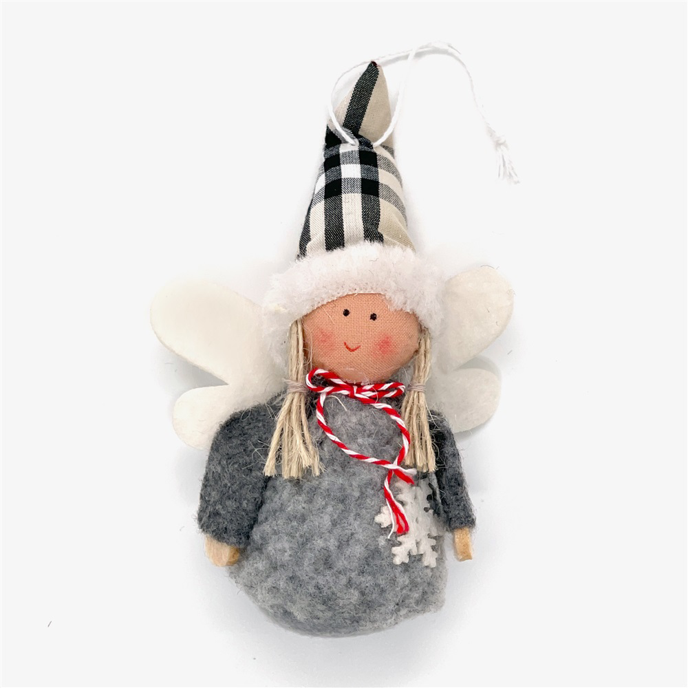 Mullig ängel i rosa pälsliknande tyg. Vit mössa och guldfärgade vingar. Att hänga i julgranen eller på annan lämplig plats.