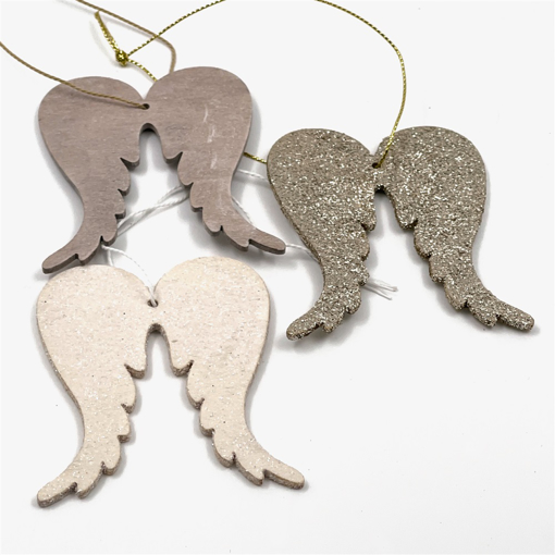 Hängande änglavingar i trä för att hänga i julgranen. Färg: Guldglittrig, vitglittrig, natur.