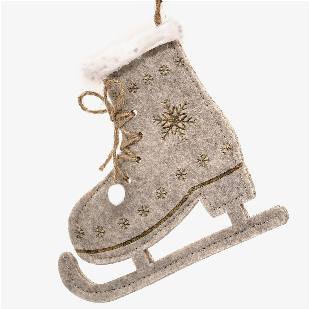 Skridsko i beige filttyg med överkant och små bollar i snöret i vitt pälsliknande material. Att hänga i fönstret eller på annan lämplig plats.