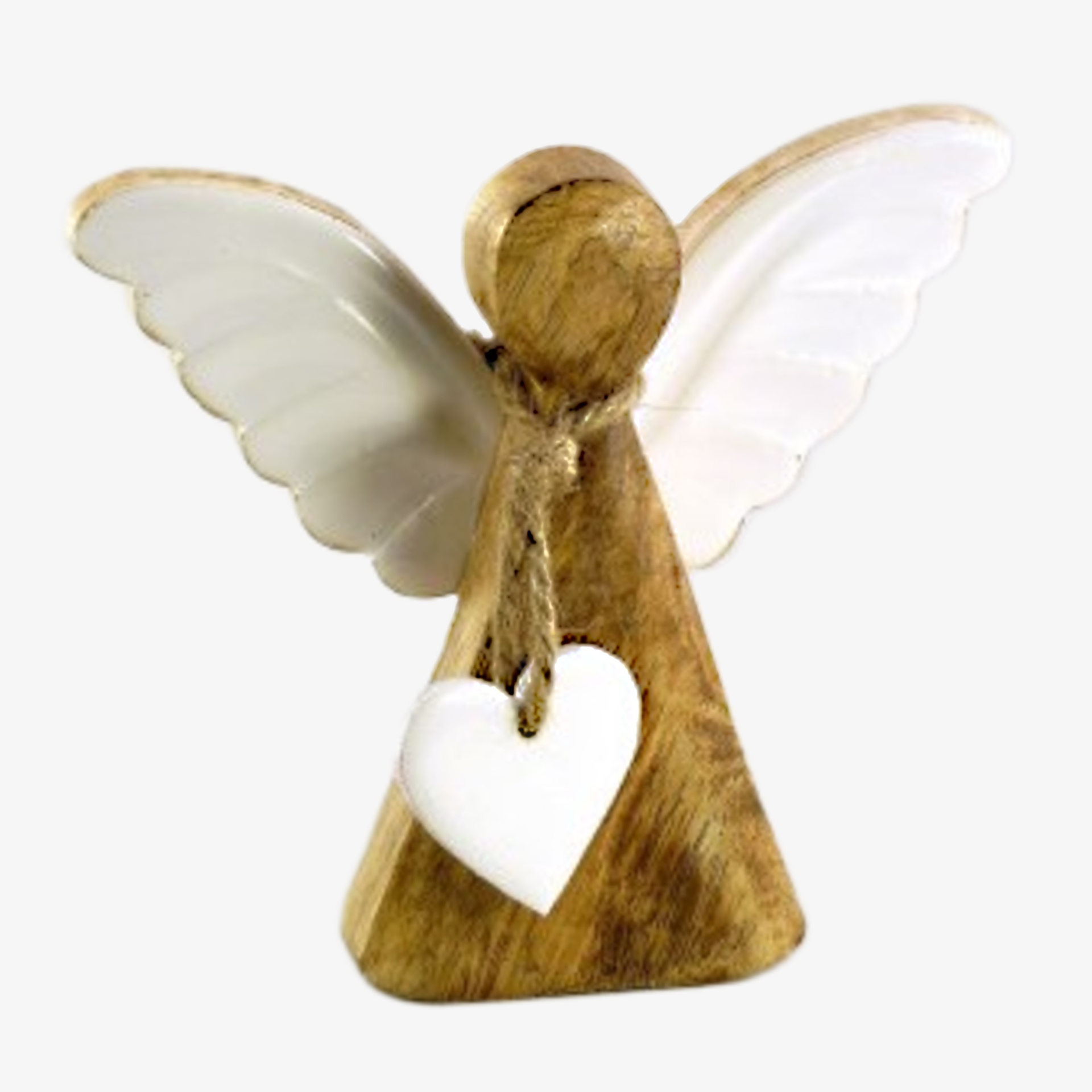 Stående ängel av mangoträd med vitglaserade vingar och hjärta.