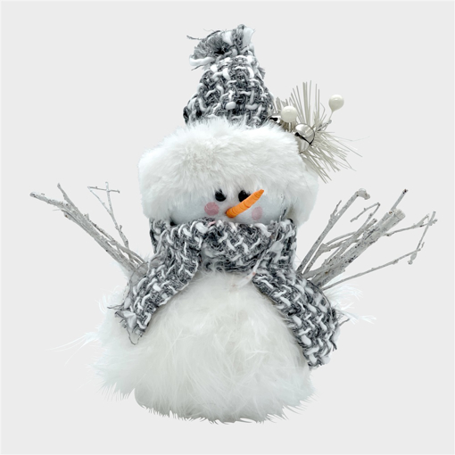 Vem blir inte glad av att ha en sån här filur stående i sitt hem under julen? Klädd i vitt pälsliknande tyg. Mössa och halsduk i rutigt tyg, motrotsnäsa i orange plast. armar i trä.
